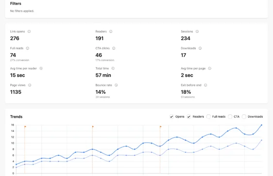 Opens, full reads, time per page, average time and CTA clicks plus device, browser and geo breakdowns.